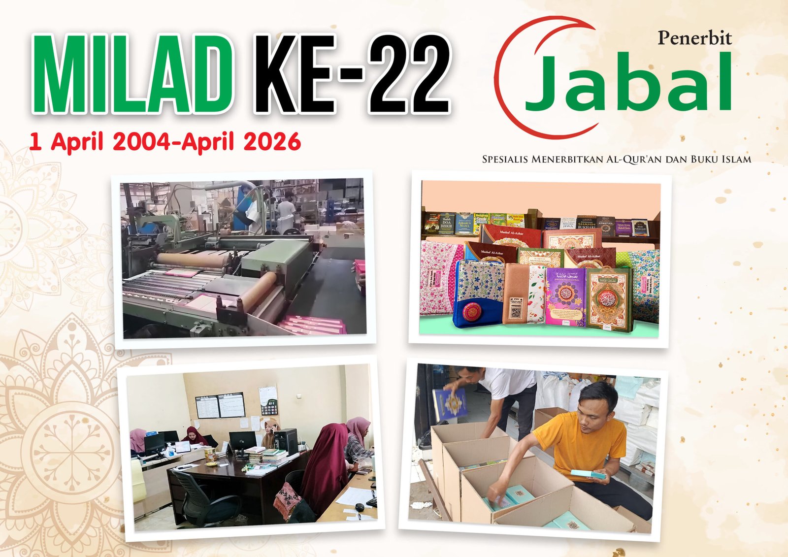 Alhamdulillah, tahun ini menjadi momen yang sangat istimewa karena Penerbit Jabal genap melangkah dan berusia 22 tahun. Berdiri sejak tahun 2004, kami terus memegang teguh komitmen dan identitas utama sebagai ‘Spesialis Menerbitkan Al Quran dan Buku Islam’. Fokus inilah yang memotivasi kami untuk terus konsisten menghadirkan cetakan fisik berkualitas di tengah era digital yang serba instan.